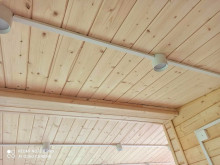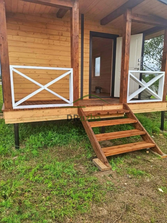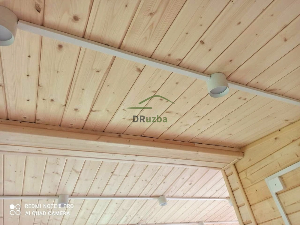 Наружная отделка : имитация бруса, камерной сушки хвойных пород сорта AB. Корпус обработан антисептиком Пинотекс на 2 слоя. Столбы и пол террасы покрыты сверхпрочной защитной лазурью Пинотекс на 2 слоя.