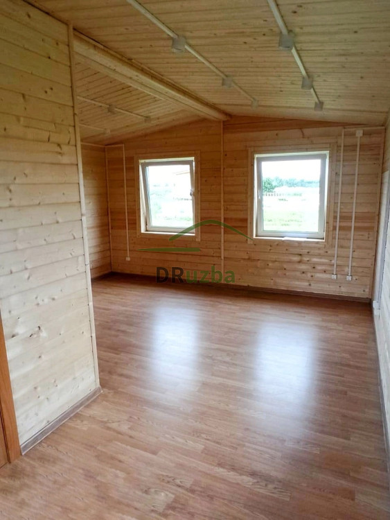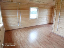 Внутренняя отделка : Пол - ламинат. Стены и потолок - имитация бруса, камерной сушки хвойных пород сорта AB.