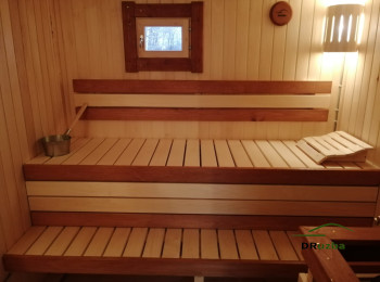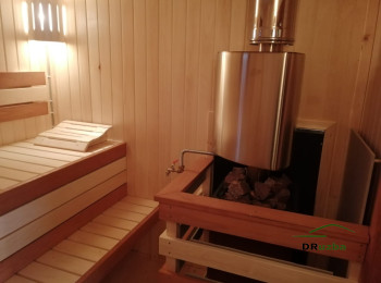 Специалисты установили печь, позаботились об инженерных коммуникациях и отделке стен, пола, потолка. У входа – дощатая терраса, которая в теплое время года может быть использована для отдыха на свежем воздухе.