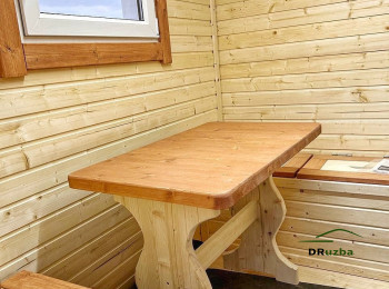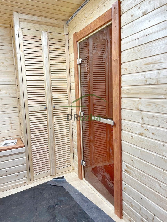 Внутреннее пространство разделено на 2 зоны. Парное отделение с отделкой из вагонки. Древесина обработана специальными составами, которые защищают ее от воздействия влаги и высоких температур. Дверь в парилку из высокопрочного закаленного стекла. В комнате отдыха установлен стол для приятных чаепитий в кругу семьи или друзей. В подарок заказчики получили от нас дровяник из 3 сот и 2 деревянных вазона под уличные растения.