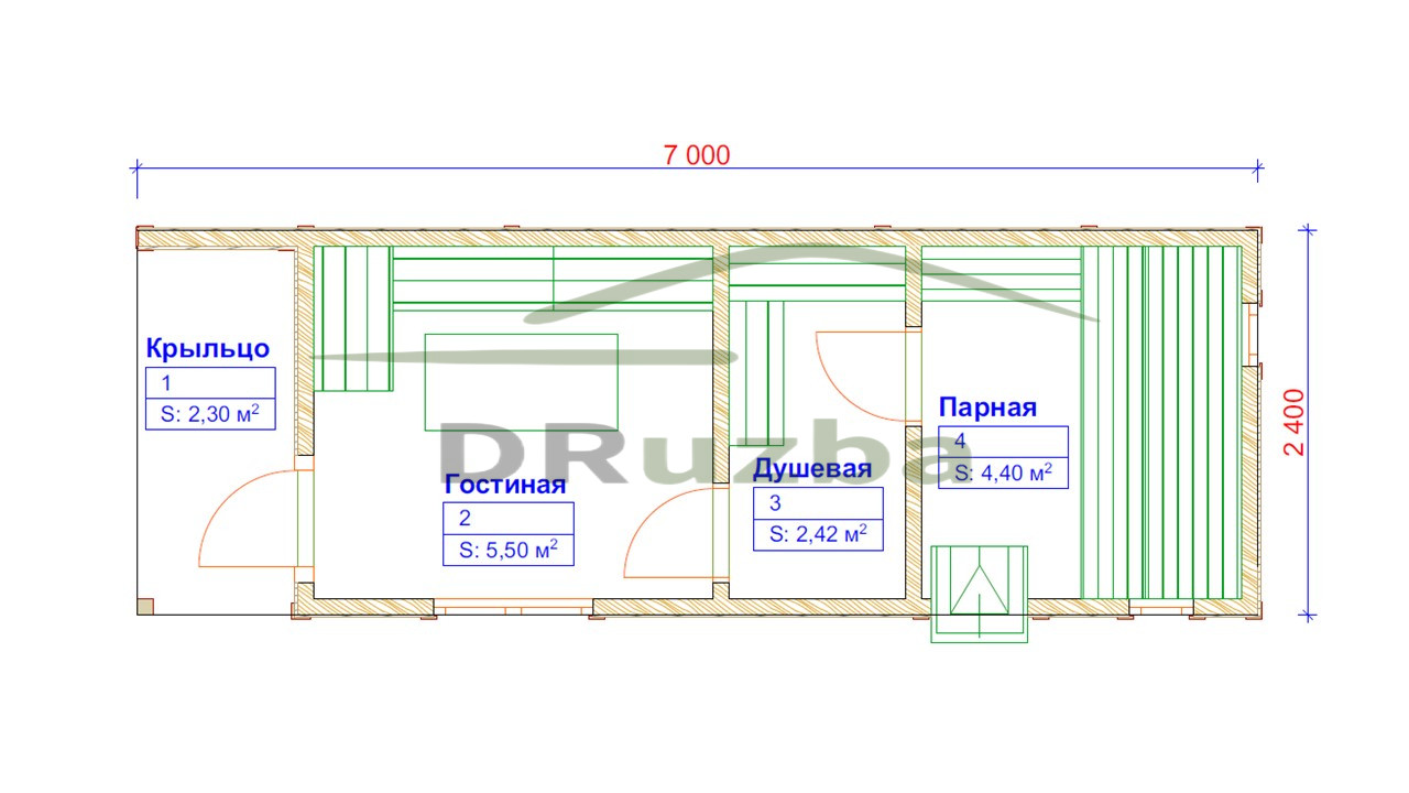 Линейный размер данной бани 2,4х7,0 метров.